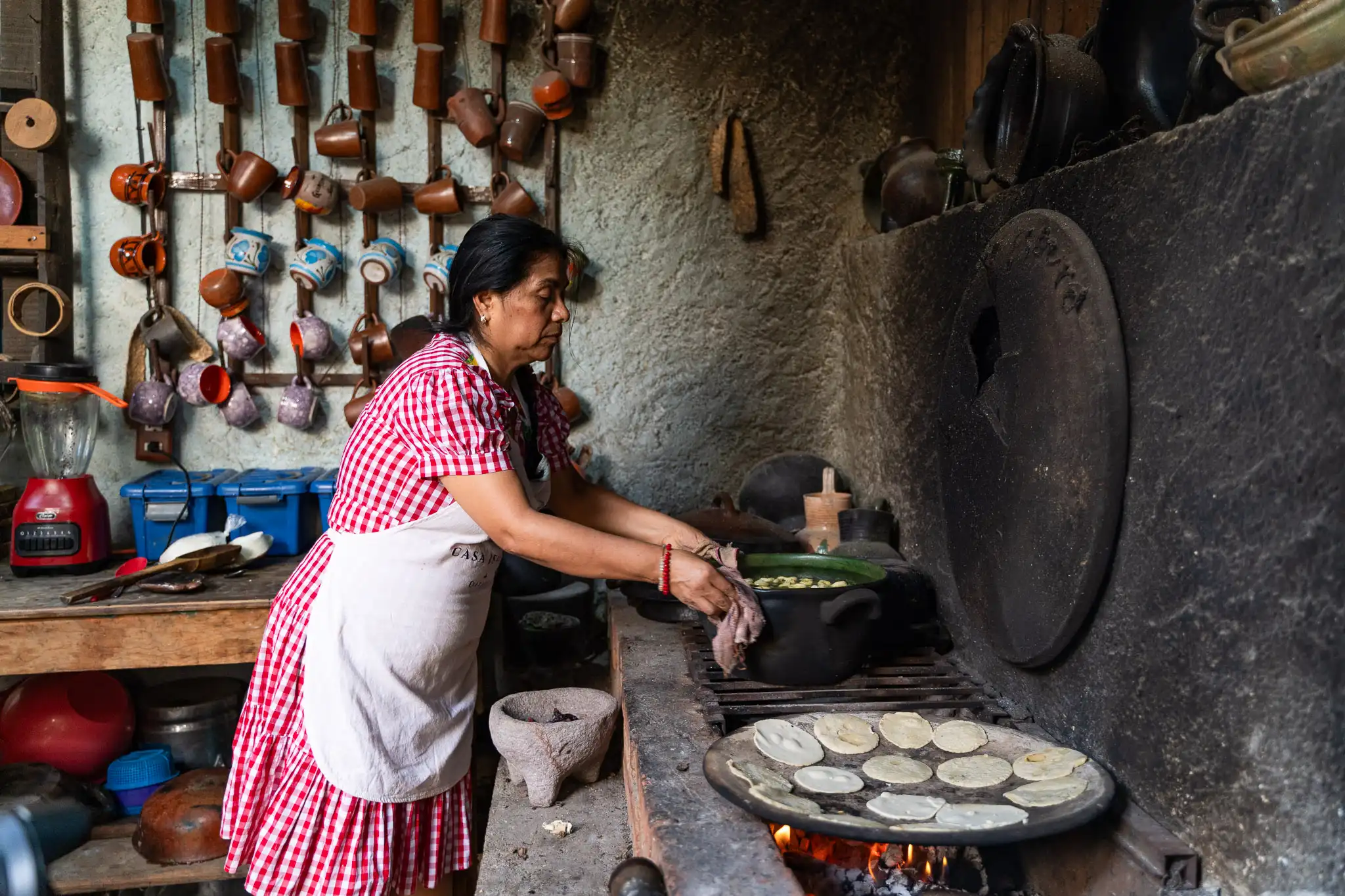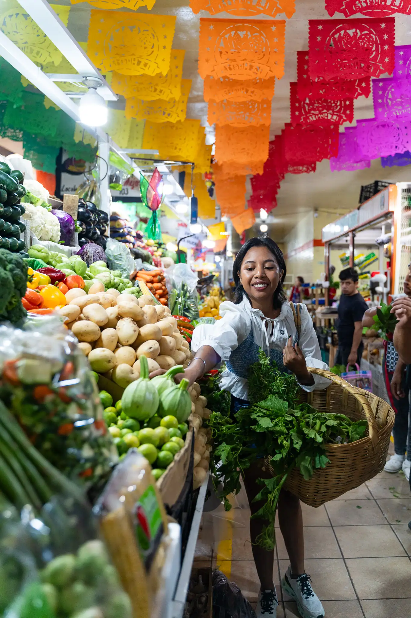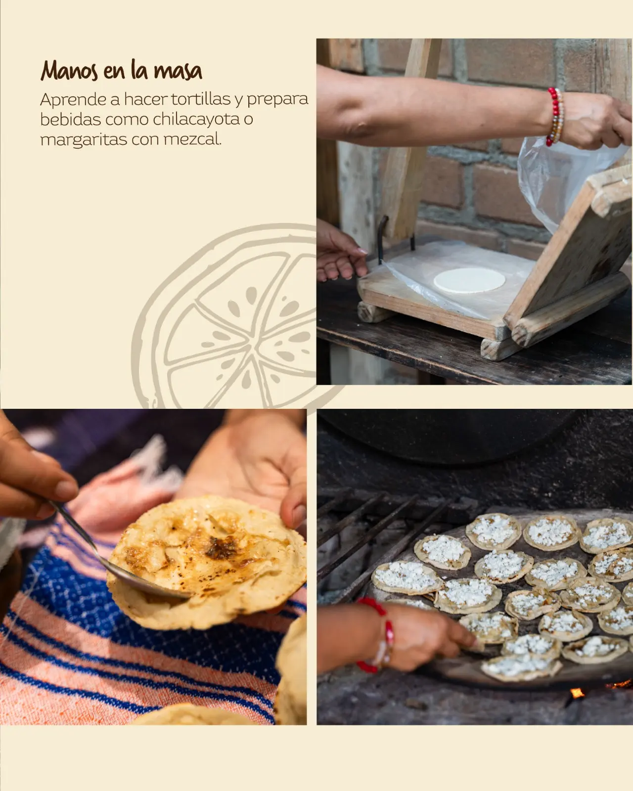 Además, se prepararán bebidas típicas como chilacayota y margaritas con mezcal, y tendrás la oportunidad de hacer tortillas a mano. Tras la compra de los ingredientes, nos dirigiremos al taller de cocina, donde cocineros experimentados te guiarán paso a paso en la preparación. Además de recibir indicaciones del chef, se repartirán mandiles y recetas para facilitar el proceso, y los participantes identificarán los ingredientes para